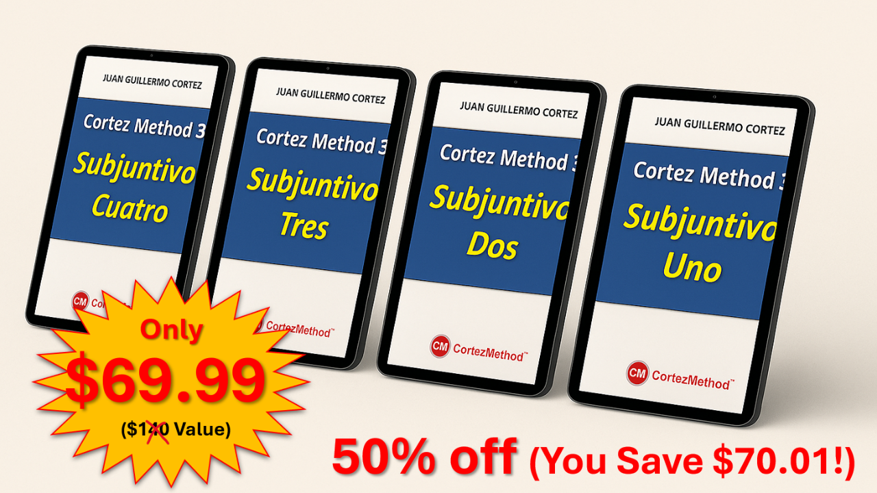 This bundle includes all four Subjunctive-level eBooks of the Cortez Method. Review consistently, practice out loud, and embrace the mode of possibility, doubt, and emotion in Spanish. All rights reserved to the author and publisher.